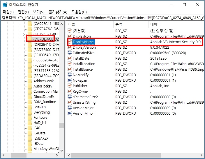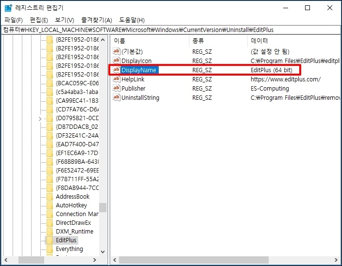 폴더 하나를 선택하시면 우측 DisplayName에 해당 프로그램의 이름이 나옵니다.