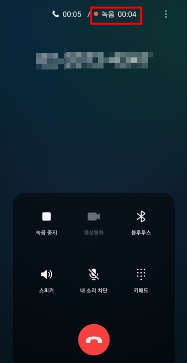 전화기 오면 상단에 [녹음]과 함게 녹음 시간이 표시됩니다.