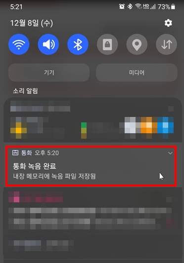 통화가 종료되면 알림 메시지로 통화녹음 완료되었다고 나옵니다.