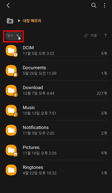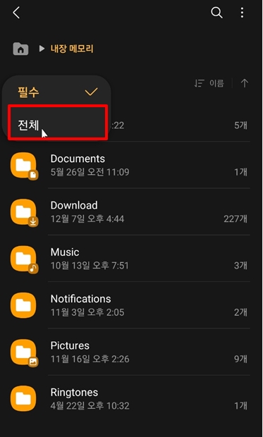 내장 메모리화면에서 필수 폴더만 보이도록 설정되어 있는데요.