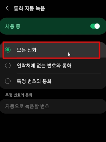 모든 전화, 연락처에 없는 번호와 통화, 특정 번호와 통화 중 선택합니다.