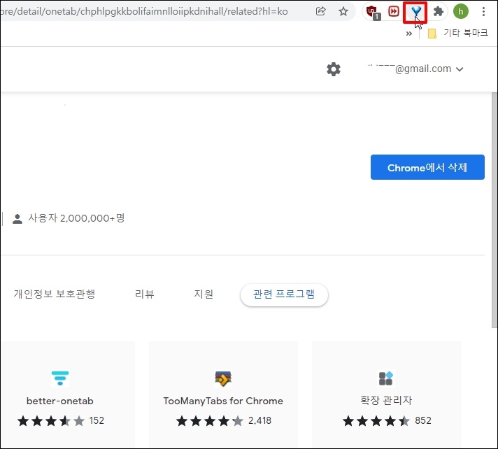 새로운 아이콘이 생겼습니다. 현재 임시 저장할 탭을 모두 띄우고 새로 생긴 OneTab아이콘을 클릭합니다.