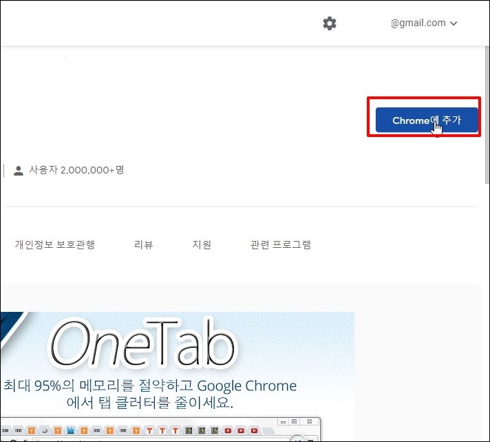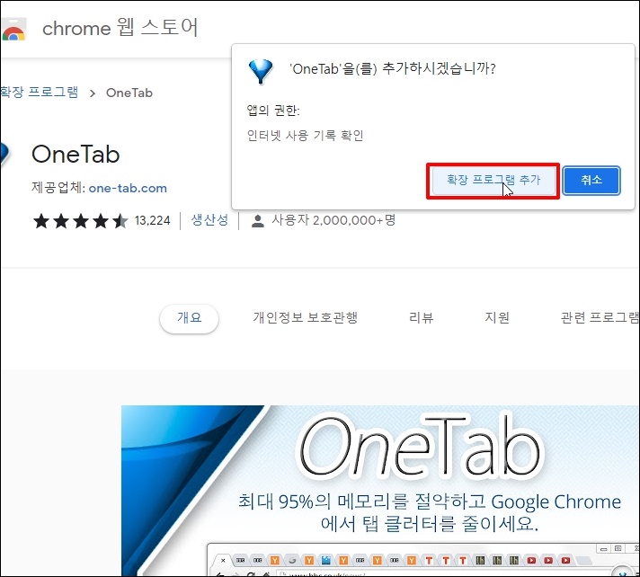 "OneTab을 추가하시겠습니까:?" 메시지가 나오면 [확장 프로그램 추가] 버튼을 클릭합니다.