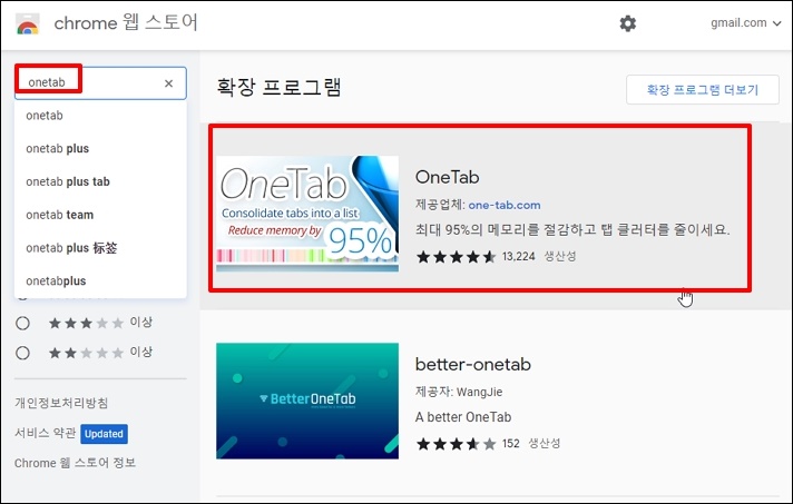 Chrome 웹 스토어창이 열리면 검색에 "onetab"을 입력 후 엔터키를 눌러주세요.