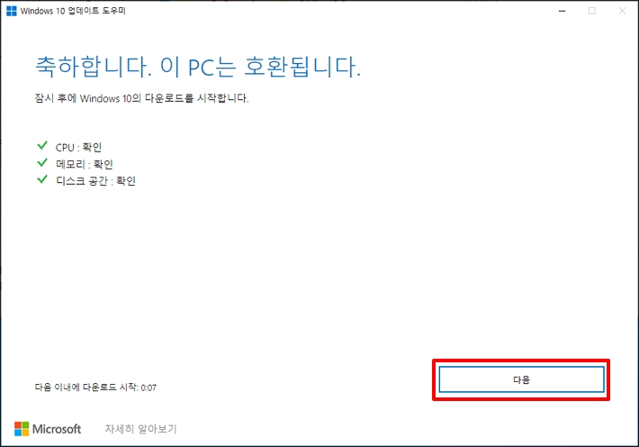 윈도우 10 업그레이드 버전이 설치하려는 컴퓨터 사양에 적합한지 확인합니다.