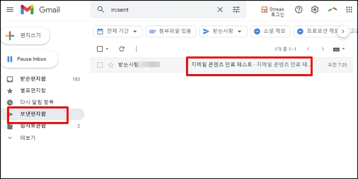 지메일 로그인 후 [보낸 편집함]을 선택합니다. 연장하려는 보낸 메일 제목을 클릭합니다.