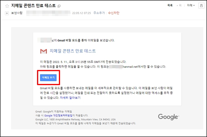 메일을 받은 사람은 아래와 같은 메일 보기 링크가 있는 메일을 받게 되는데요.