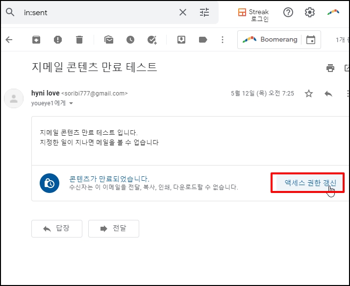 보낸 메일을 클릭하면 상세 내역에 해당 내용의 메일이 보내는데요. 기간 연장을 하시려면 [액서스 권한 갱신]을 클릭하시면 연장됩니다.