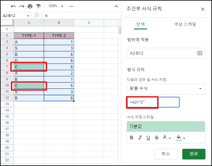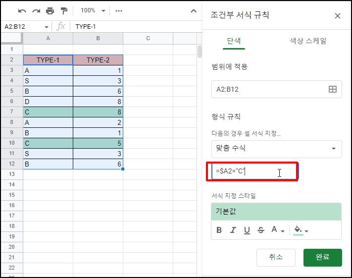 "C" 값을 가진 셀만 색 적용된 것을 확인할 수 있습니다.