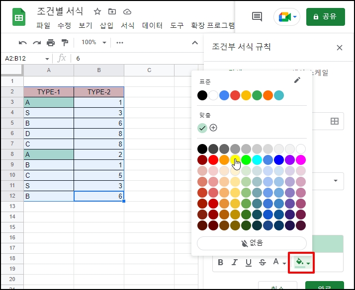구글 스프레드시트 사용 시 엑셀과 같은 조건부 서식 기능이 있습니다.