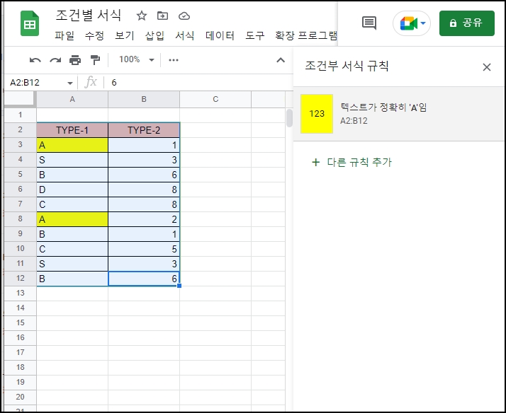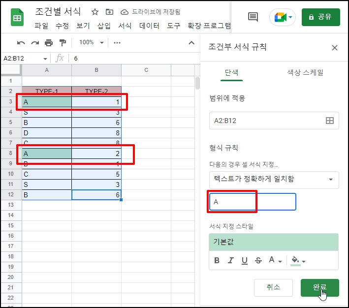 "A" 값을 가진 셀이 지정된 색으로 적용되었습니다.