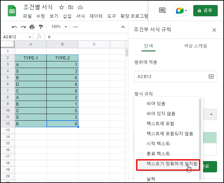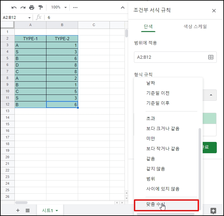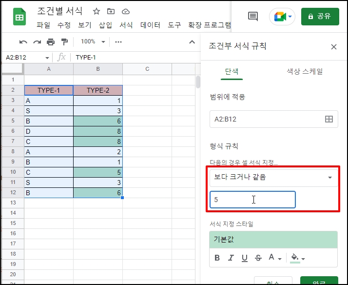 구글 스프레드시트 조건부 서식 같은 값 보다큰 값 맞춤 수식 찾기