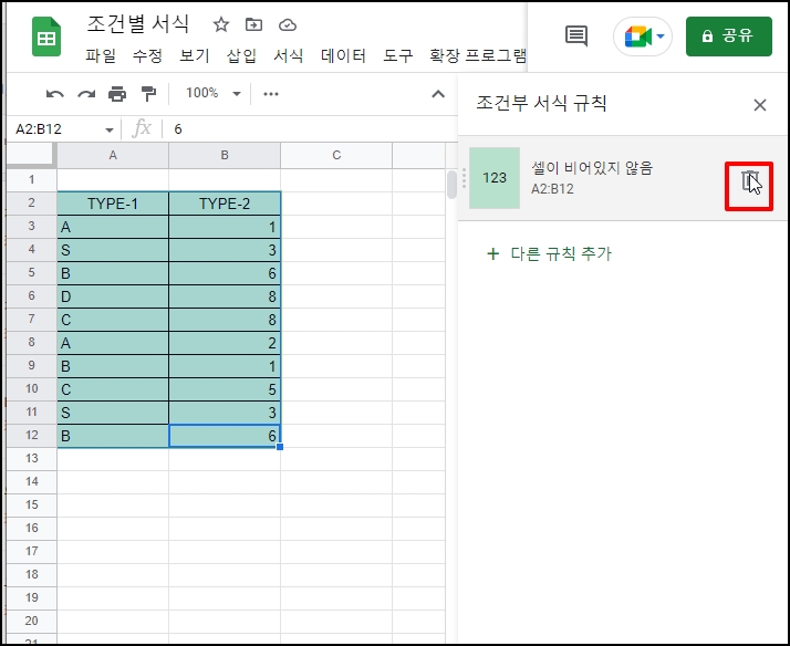 규칙을 삭제하려면 생성한 규칙 오른쪽에 마우스 오버하면 휴지통 모양 아이콘이 생기는데요 클릭하시면 조건 별 서식이 삭제됩니다.