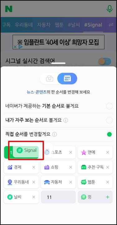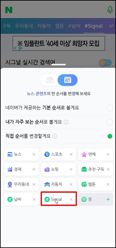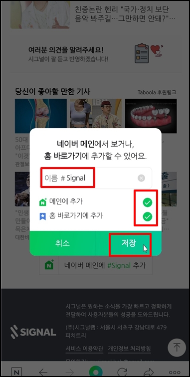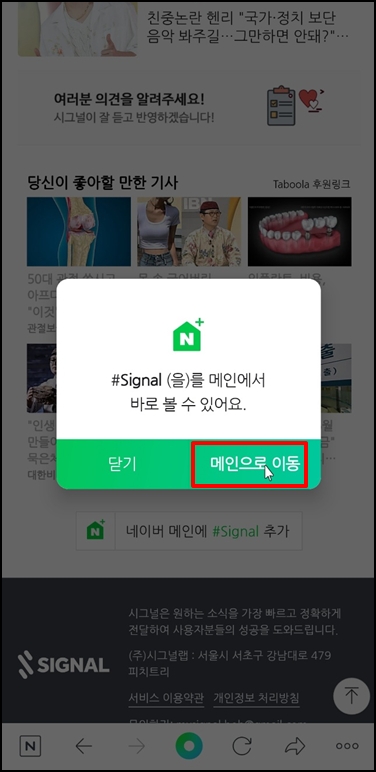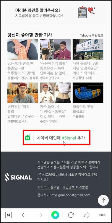 화면 하단에 [#네이버 메인에 Signal 추가] 버튼을 눌러주세요