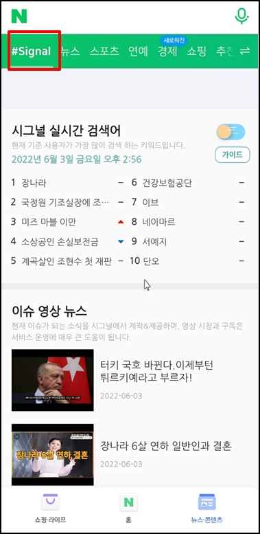 네이버앱을 실행 후 검색란에 "signal.bz/news" 를 입력 후 돋보기 모양 눌러주세요