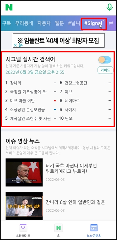 네이버 앱을 실행 후하단 [뉴스 콘텐츠]를 누르시면 실시간 검색어가 바로 보입니다.