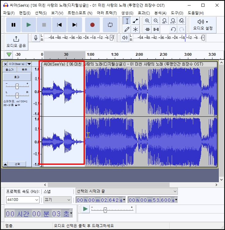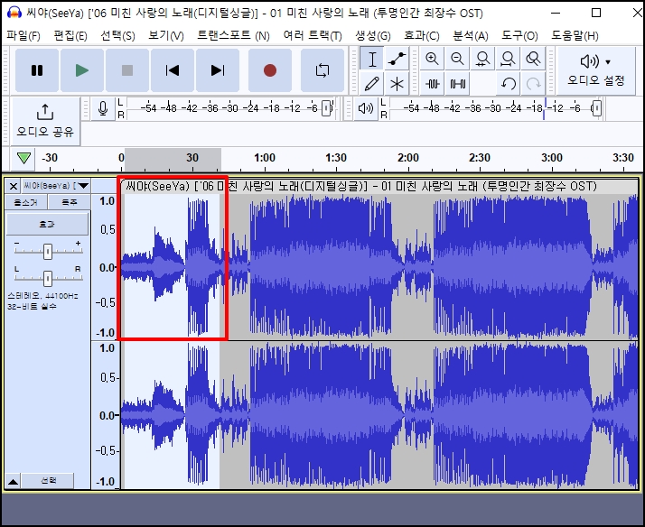 음악을 재생하면서 편집할 부분을 드래래그로 지정합니다.