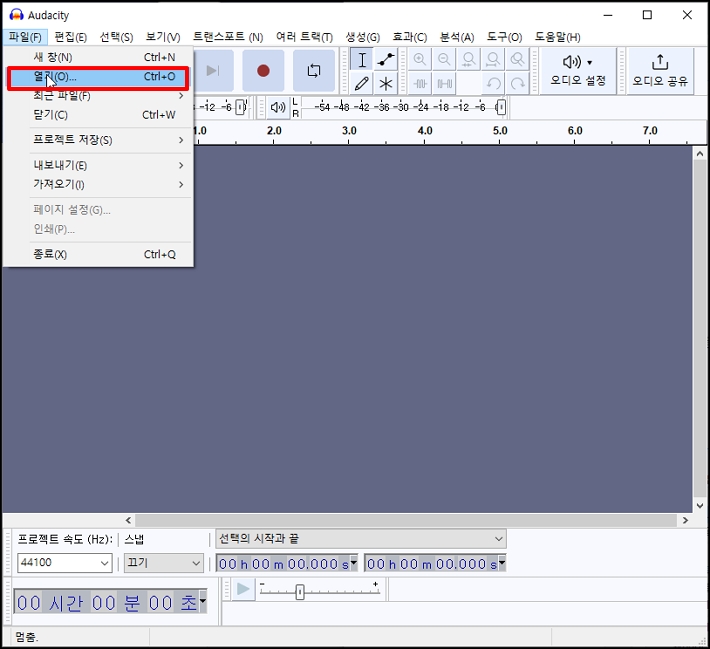 음악 파일을 불러와 편집을 하기 위해 상단 메뉴 즁 [파일] -[열기]를 선택합니다.