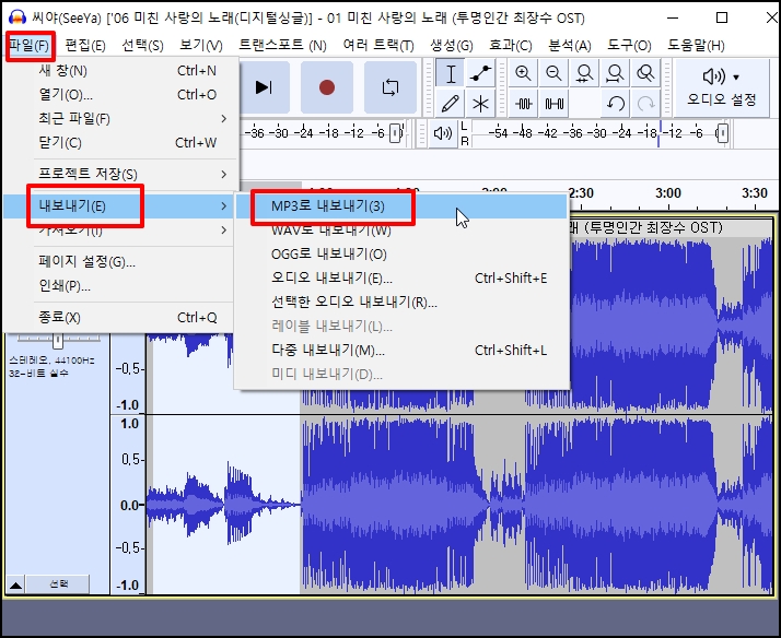 [파일 ]-[내보내기]를 선택하시면 mp3, wav, ogg 등의 파일로 저장할 수 있습니다.