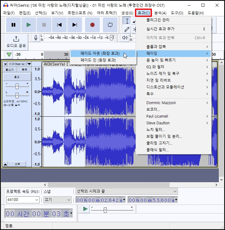 드래그 선택 상태에서 상단 메뉴 중 효과를 선택하시면 실시간 효과, 노이즈 제거, 노치필터, 페이딩 등을 설정할 수 있습니다.