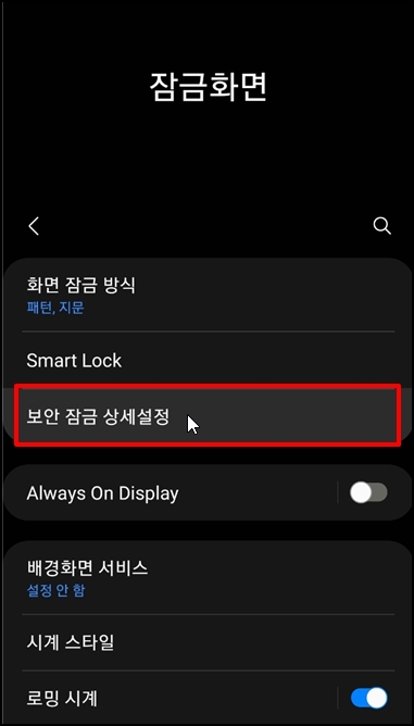 잠금 화면으로 이동하면 메뉴 중 [보안 잠금 상세 설정]을 선택합니다.