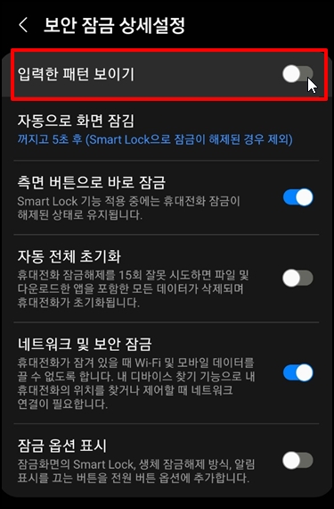 보안 잠금 상세 설정 화면에서 [입력한 패턴 보이기]를 [끔]으로 해서 비활성화합니다.