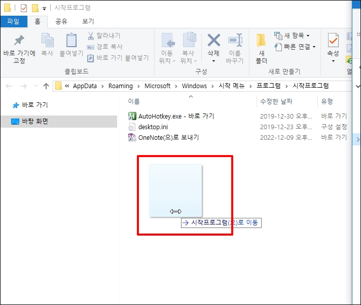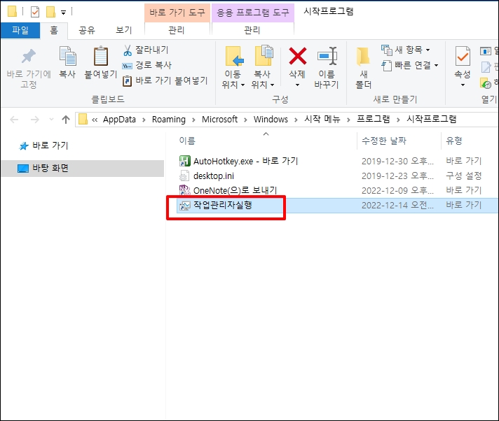 바탕화면에 만들어 놓은 "작업관리자 실행" 파일을 이 폴더로 이동하기 위해 드래그 드롭합니다.