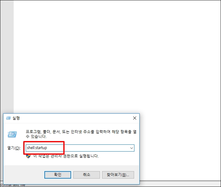 입력 박스에 "shell:startup" 을 입력 후 엔터키를 눌러주세요