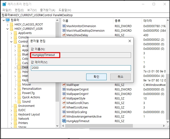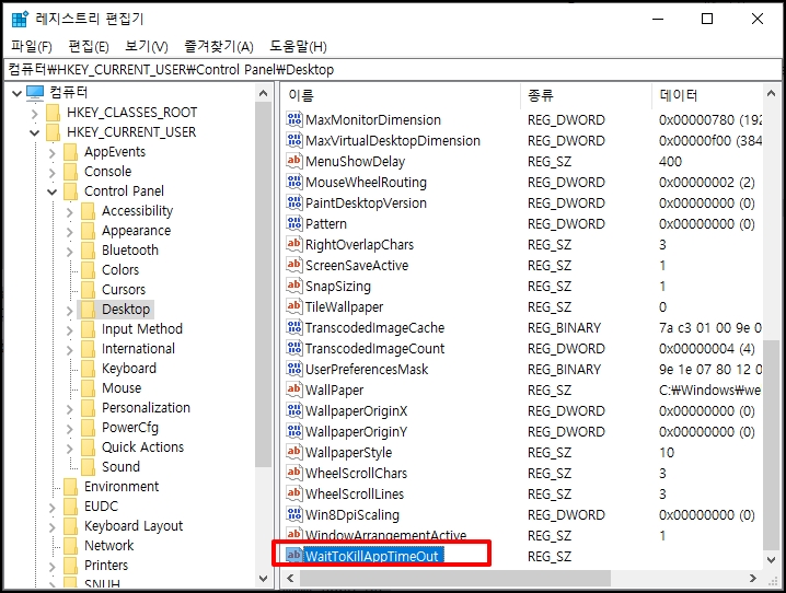 값이 새로 만들어지면 이름을 "WaitToKillAppTimeOut"로 변경 후 더블클릭합니다.
