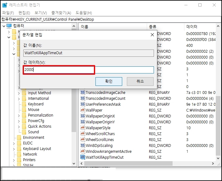 문자열 편집 창이 열리면 값 데이터를 "2000" 으로 입력합니다.