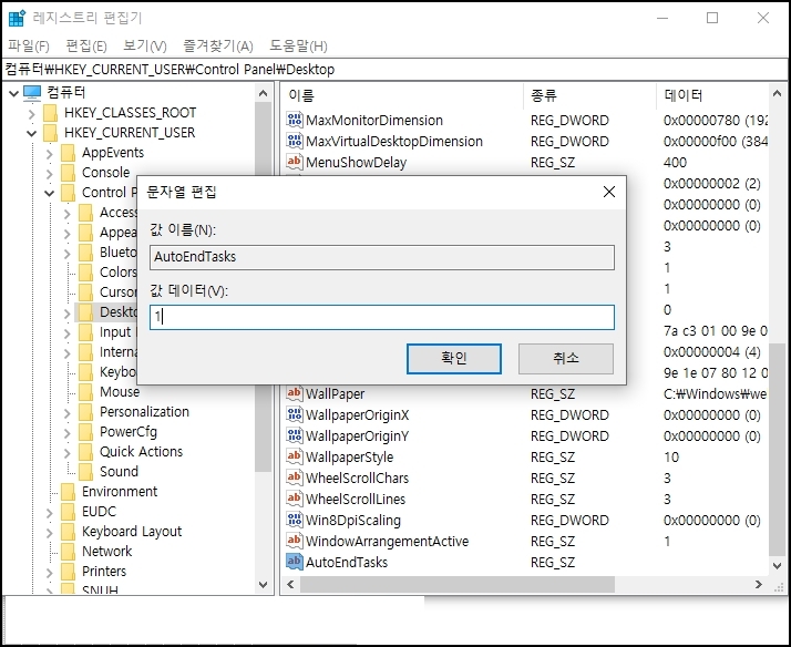 마지막으로 "AutoEndTasks"항목을 만들고 값을 "1"로 입력합니다.