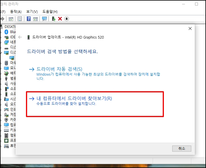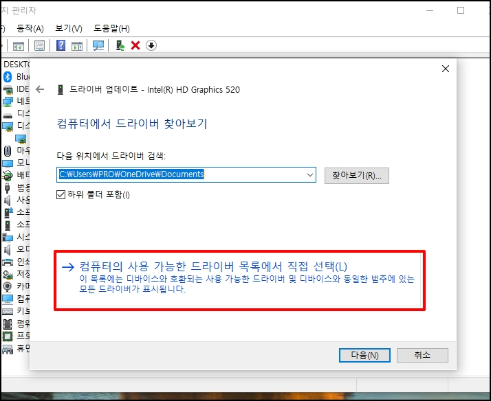 컴퓨터에서 드라이버 찾아보기 화면으로 이동하면