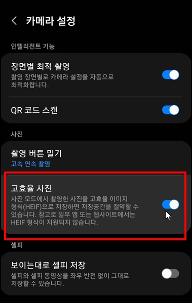 설정 화면으로 이동하면 [고효율 사진] 항목이 나옵니다.
