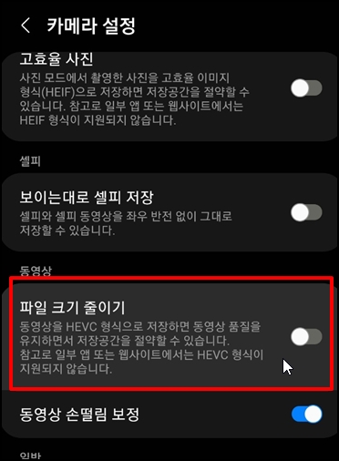이 기능이 켜지면 동영상 저장 방식이 HHEVC 형식으로 저장돼서 동일한 동영상 품질로 공간을 절약할 수 있습니다.