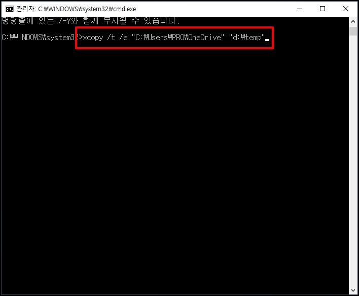 xcopy /t /e "C:\Users\RRO\OneDrive" "d:\temp" 를 입력 후 엔터키를 눌러주세요