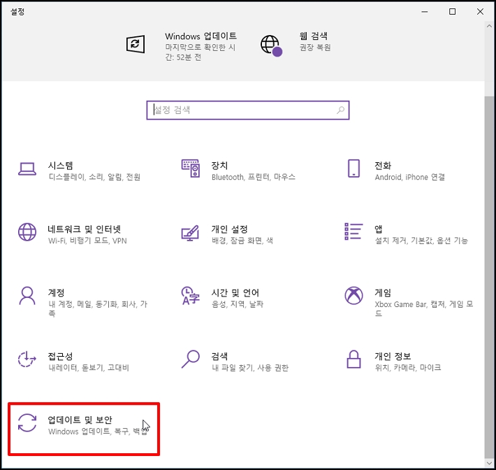 항목 중 [업데이트 및 보안]을 선택해 주세요
