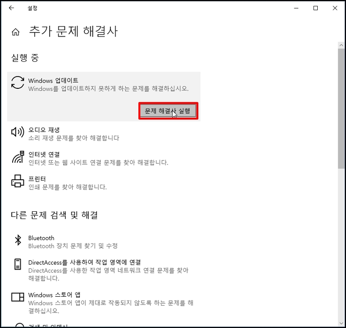 추가 문제 해결사가 실행하면 Windows 업데이트에 항목을 선택 후 [문제 해결사] 버튼을 클릭합니다.