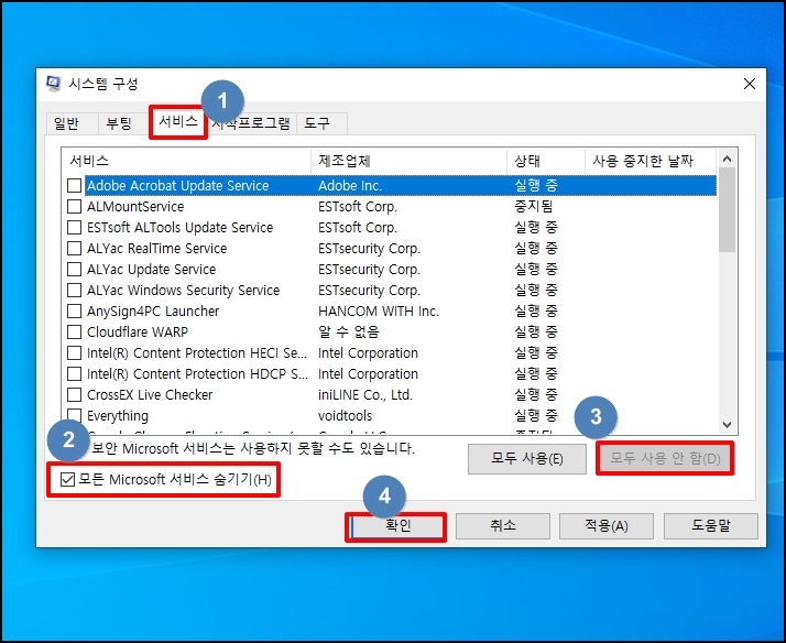 서비스 탭으로 이동하면 좌측 하단 [모든 Microsoft 서비스 숨기기]에 체크 후 우측 [모두 사용 안 함] 버튼을 눌러주세요