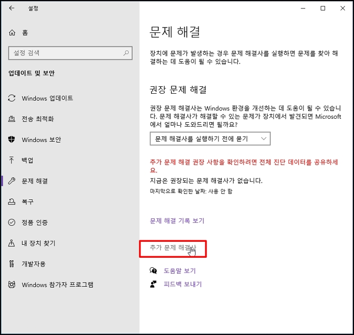 좌측 항목 중 [문제 해결]을 선택 후 우측 [추가 문제 해결사]를 선택합니다.