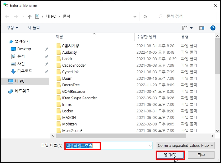 탐색기 창이 열리면 저장할 엑셀 파일 이름을 지정 후 [열기] 버튼을 클릭합니다.