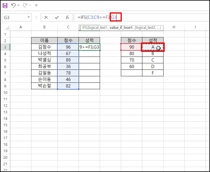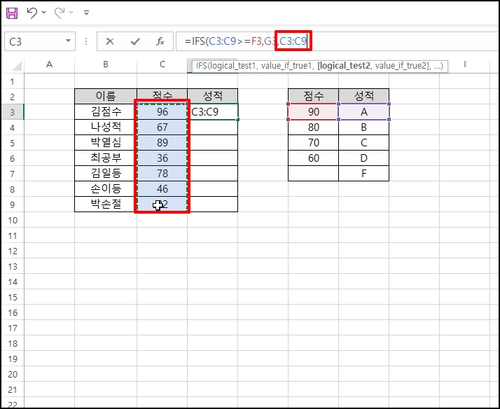 90점이 입력되어 있는 "F3"를 참조해서 =IFS("C3:C9>=F3를 입력합니다.