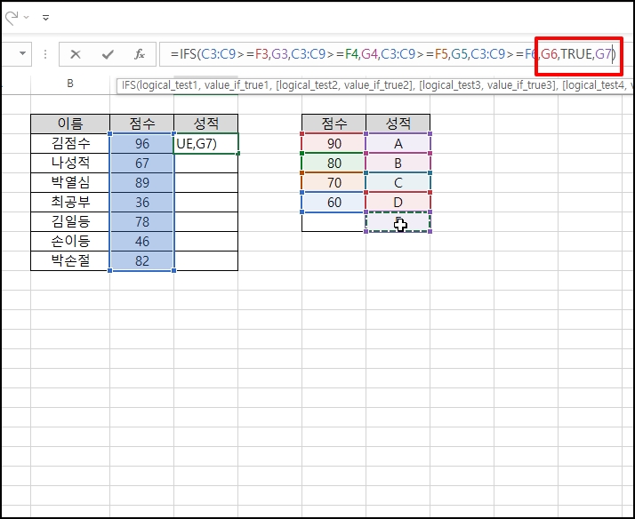 나머지 조건도 계속 입력 후 마지막 60점 미만을 추가하기 위해, "TRUE" ,"G7"을 입력합니다.