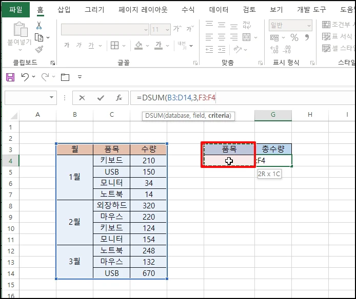 "=DSUM(" 까지 입력 후 제목을 포함해서 범위를 드래그해서 지정합니다.