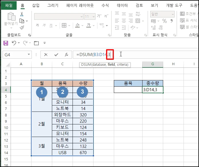 필드 순번으로 진행해 볼게요 데이터가 입력된 행에서 "월","품목","수량"이 있는데 "수량"이 3번째 위치하고 있으므로