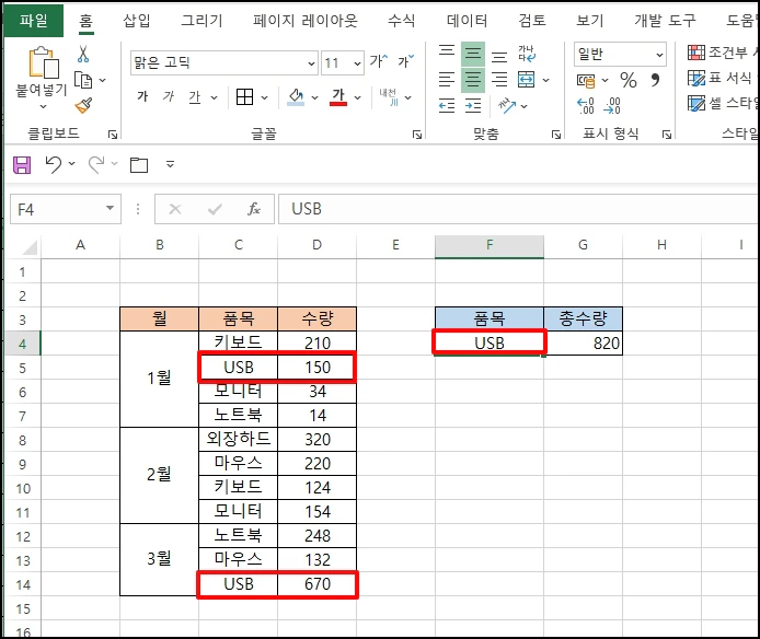 "USB" 수량을 구해보겠습니다. "품목"에 "USB"를 입력합니다.