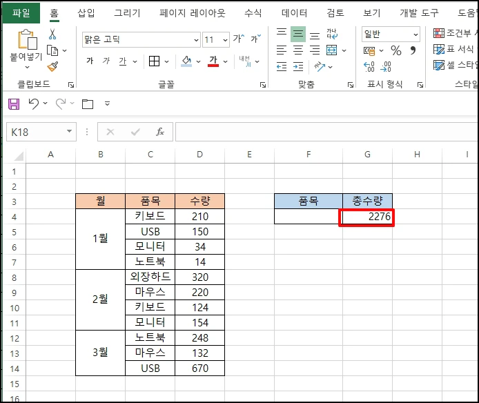 우측에 원하는 품목을 입력하면 해당 항목의 총 수량을 구해보도록 하겠습니다.