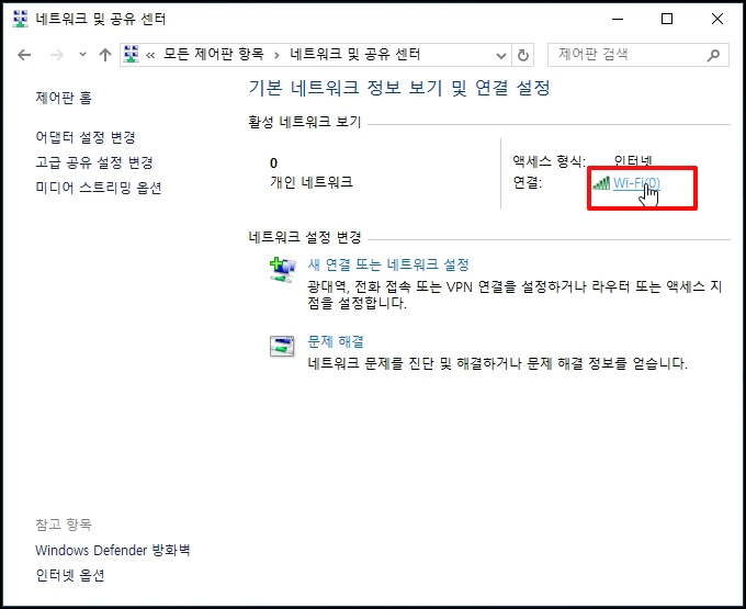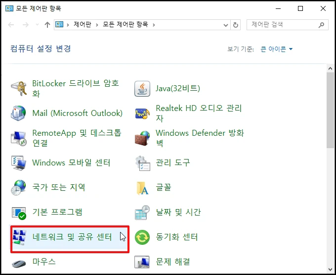 제어판 창이 실행되면 [네트워크 및 공유 센터]를 선택합니다.