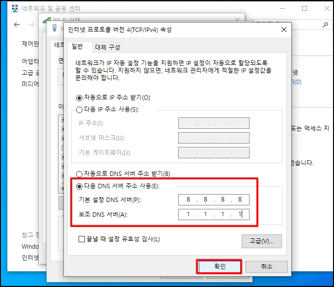 속성 창이 열리면 DNS 주소를 아래 주솟값으로 입력 후 [확인] 버튼을 클릭합니다.