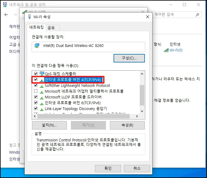 속성 창이 열리면 [인터넷 프로토콜 버전 4(TCP/IPv4) 를 더블클릭 해주세요