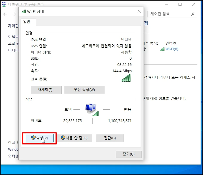 상태 창이 열리면 [속성] 버튼을 클릭해 주세요